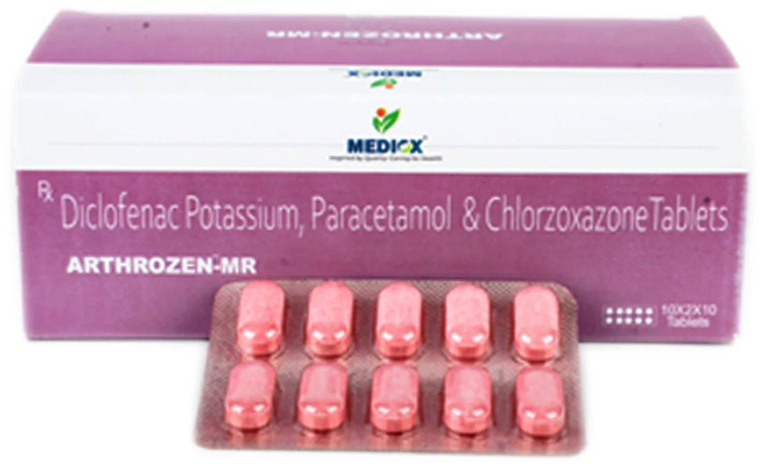 Arthrozen MR Tab is a powerful muscle relaxant and pain-relief medication formulated with Diclofenac Potassium (50mg), Paracetamol (325mg), and Chlorzoxazone (250mg). It is effective in treating musculoskeletal pain, muscle spasms, and inflammatory conditions like arthritis and sprains.